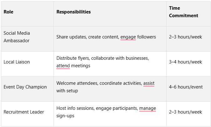 Measuring Impact: Track registrations generated through rep referrals, social media engagement, attendance at info sessions, volunteer retention rates, and growth in event participation.